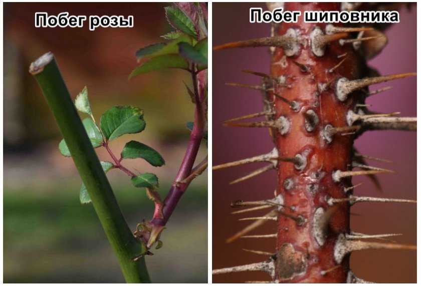 - Ветви у розовых кустарников имеют красноватый оттенок, со временем побеги зеленеют. У шиповниковых особей изначально зеленоватая поросль, которая выбрасывается от корней, а у розы они возникают выше точки соприкосновения корневой системы и стебля.