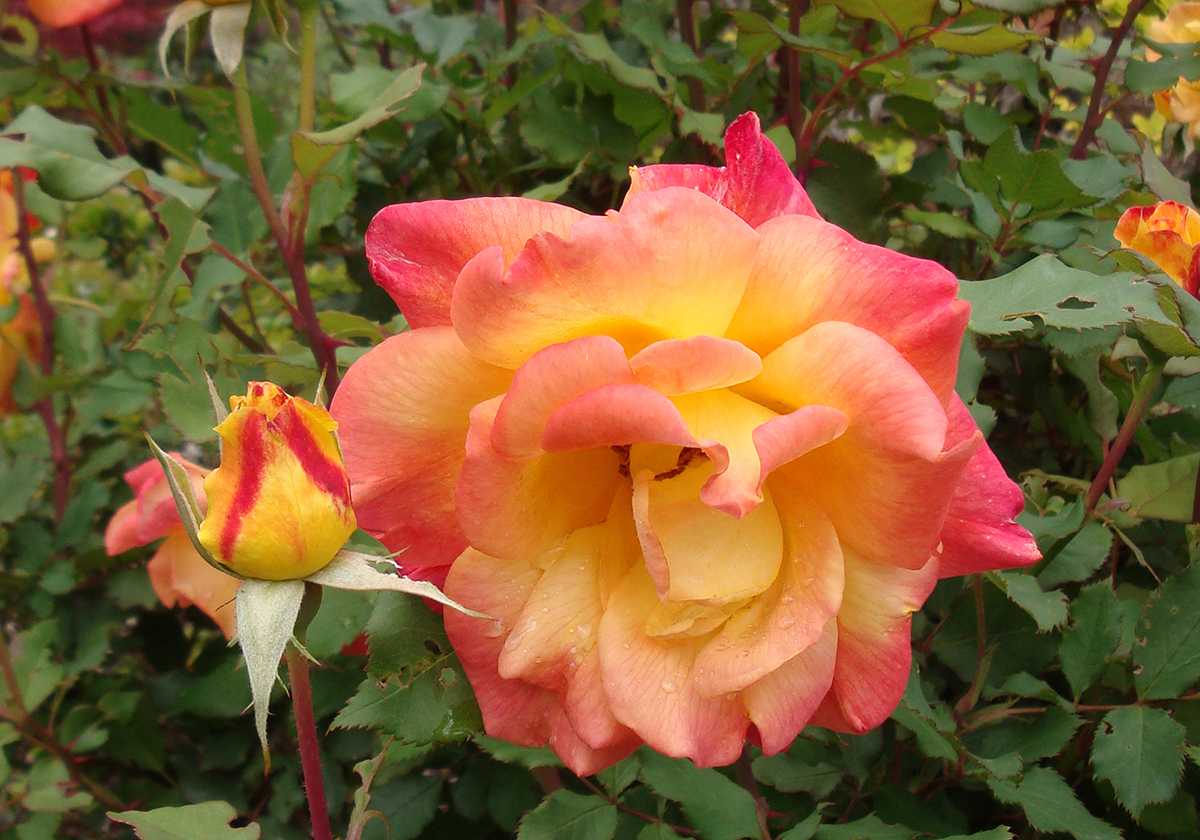 Роза Tequila (Текила). Одновременно на одном растении можно видеть три цвета: бутон — ярко-оранжевый, распустившийся цветок — нежно-желтый с лососевым налетом, перед опадением — кремово-белый. Цветки махровые.