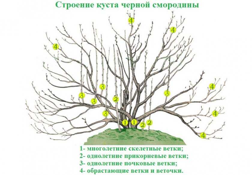 Среди сортов чёрной смородины есть высокорослые и среднерослые растения, но любой куст состоит преимущественно из 15–20 тонких побегов разного возраста и толщины.