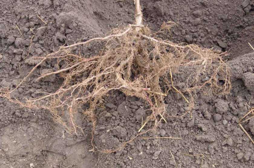 Все кусты чёрной смородины обладают развитой корневой системой, которая эффективно поглощает из почвы необходимую для растения влагу и крепко удерживает в вертикальном положении массивные ветки с плодами. Корни кустарника имеют небольшую толщину, а их основная часть залегает на глубине 40–45 см от поверхности грунта. Общий диаметр корневой системы равен диаметру наземной части растения.