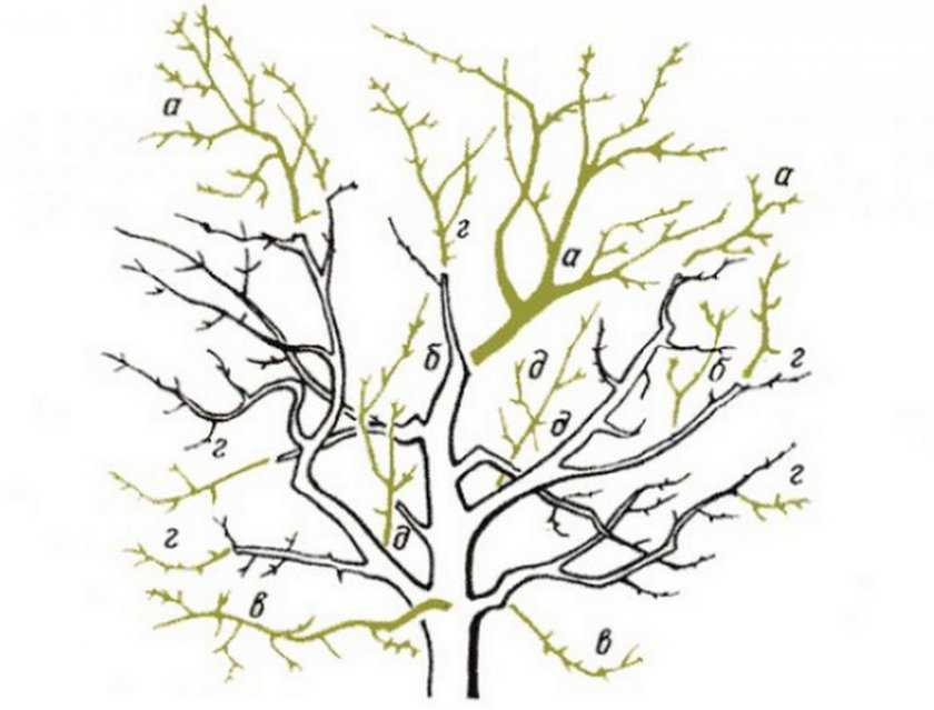 Омолаживающая обрезка кроны яблони: а — раскрытие центра и снижение высоты; б — прореживание; в — обрезка обвисших ветвей; г — обрезка в зоне отступающего роста; д — удаление лишних волчков