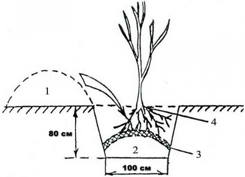 1 — верхний плодородный слой почвы; 2 — верхний плодородный слой почвы с добавлением перегноя и минеральных удобрений; 3 — слой почвы без удобрений; 4 — корневая шейка (место прехода корневой системы в ствол)