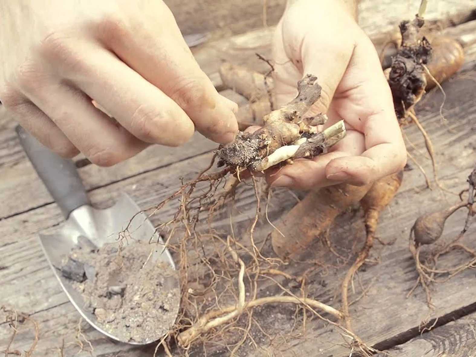 - Корни промывают, подсушивают и осматривают. Слишком длинные и сухие корешки удаляют, а места срезов присыпают золой или активированным углем.