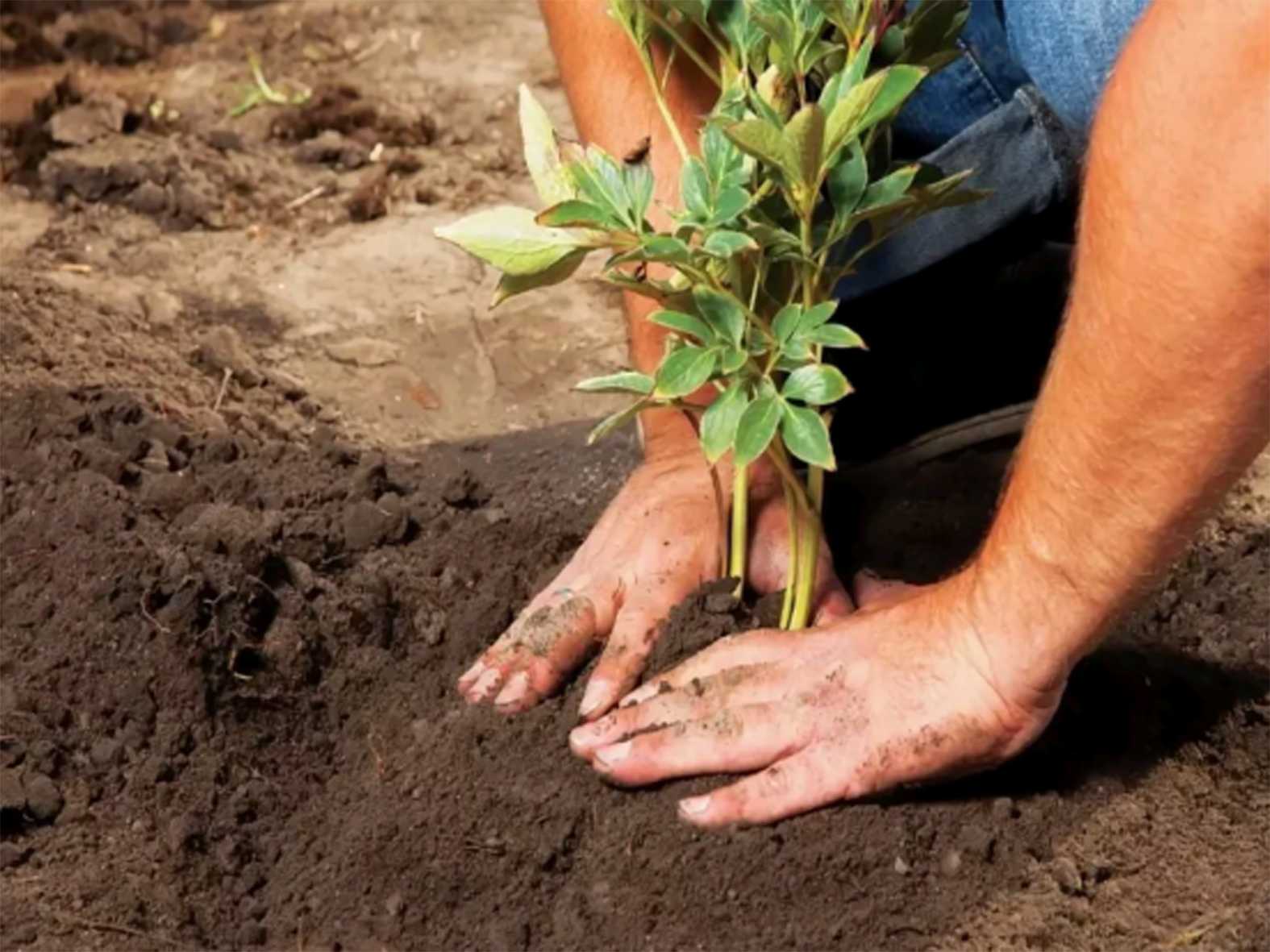 Перед посадкой пионов готовят посадочную яму, которая не должна быть очень глубокой, но в которой корни растения разместятся свободно. В неё засыпают подготовленную почвенную смесь (перепревший навоз в смеси с растительным перегноем, песком, глиной, в соотношении примерно 3:2:1:1; и добавленными в эту смесь питательными веществами, древесной золой и гашённой известью, если почвы очень кислые). Растения размещают в яме так, что бы почки были на 2-3 см ниже уровня почвы, засыпают почвенной смесью, уплотняют почву, обильно проливают, чтобы вся земля вокруг растений осела. Вокруг ямы рассыпают удобрения пролонгированного действия, и засыпают сухой земляной смесью