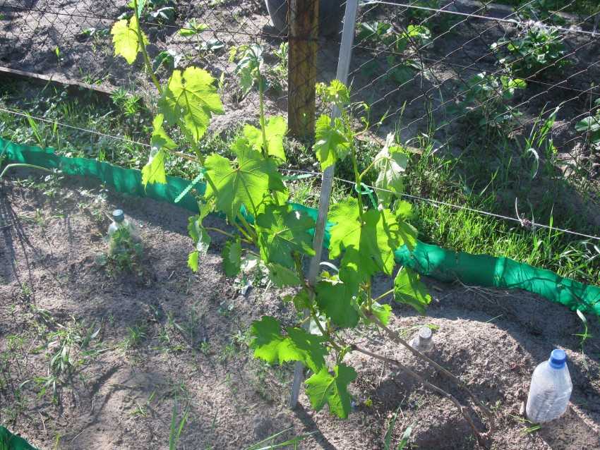 Когда плети будут подвязаны, растения удобряют, вскапывают приствольный круг. Опытные виноградари советуют выкапывать возле ствола небольшую ямку, так при поливе влага будет поступать прямо к корням.