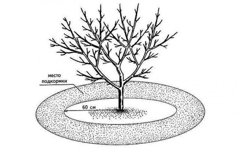 На протяжении первых 3 лет жизни растения подкормки вносят только в весенний период, чтобы простимулировать побегообразование. Это облегчит работу по формированию кроны. В этот период необходимы азотистые удобрения. Лучше всего чередовать через год минералы с органикой. Так, в первый год после посадки вносят по 6 ст. л. мочевины или нитрофоски на 30 л воды, в следующем сезоне используют раствор навоза — на 10 л воды добавляют 300 г куриного сухого навоза или 5 л жидкого коровяка, затем к уже полученному концентрату добавляют ещё 20 л воды.