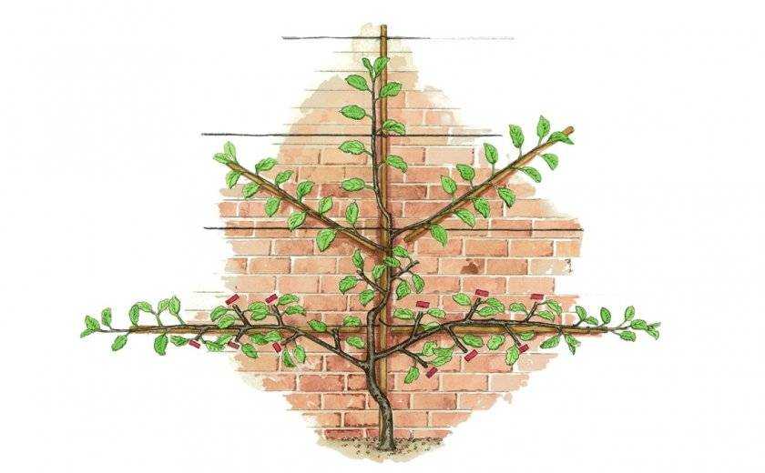 Начиная с первого года, каждую ветку направляют и прикрепляют. По мере отрастания прирост снова подвязывают к распорке, не позволяя тянутся вверх. В результате многолетней коррекции получается плоская крона, равномерно распределенная в боковом направлении.