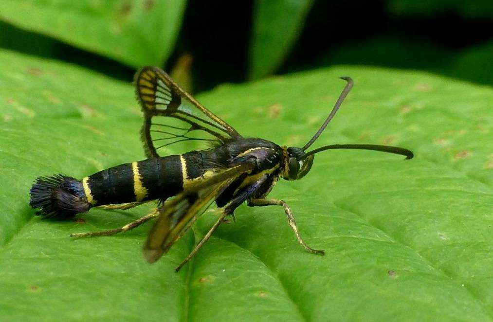 Это бабочка-вредитель Synanthedon tipuliformis CI. Лет наблюдается в последних числах июня, как раз недели через 2 после цветения черной смородины. При расправленных прозрачных крыльях ее размер достигает 25-28 мм. Небольшое продолговатое тельце все в темно-серых чешуйках. И лишь брюшко бороздят светлые поперечные полоски: у самца их 4, у самки – 3. Питаться имаго начинают соками из соцветий малины. Яйцекладки из 50-60 штук продолговатых, слегка приплюснутых яиц длиной до 72 мм смородинная стеклянница оставляет в треснутой коре дерева. Появившиеся личинки – гусеницы белого цвета с темно-коричневой головой – проделывают ходы во внутренностях веток (до 40 см!), съедая их середину. Зиму проводят там же, внутри веток, постепенно прокладывая себе путь и опускаясь книзу. Только на следующий год, ближе к осени, личинки «отъедаются», достигнув 20 мм в длину. Не выходя наружу, продолжают зимовать все в тех же ветках еще один период.