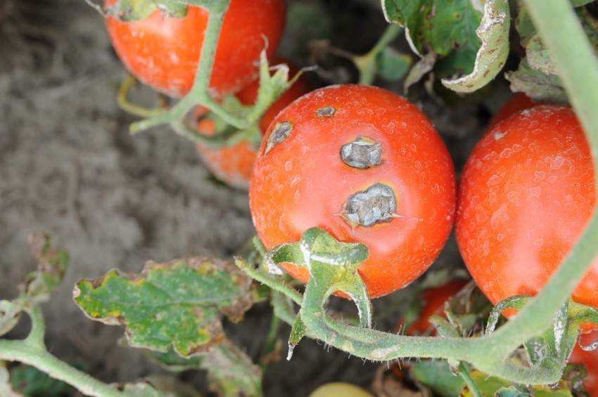 - Фитофтороз поражает стебли, листья и плоды томатов. Плоды размягчаются и гниют. Появляется болезнь при очень частых посадках и перепадах температуры воздуха.