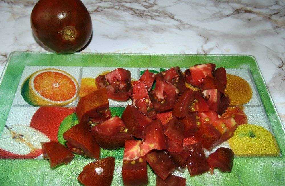 - цвет томатов, в стадии технической зрелости, бурый с коричневым отливом, при полном вызревании приобретают красно-коричневый, почти черный цвет;