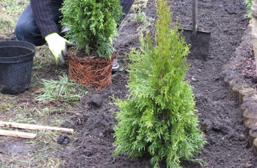 При планировании пересадки Thuja occidentalis Aureospicata надо, прежде всего, позаботиться о новом месте произрастания растения. Яму копают за несколько недель до процесса. Участок, на который будет переноситься дерево, должен полностью соответствовать предпочтениям туи, указанным выше.
