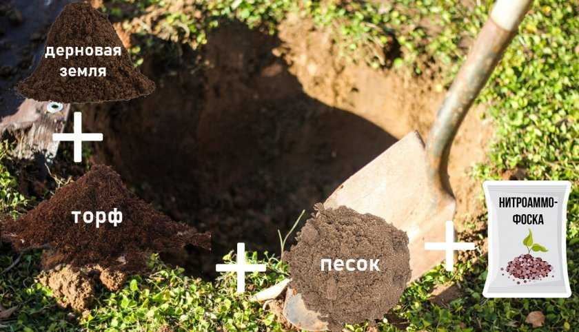Посадочную яму необходимо подготовить за несколько недель до посадки. Её нужно выкопать глубиной 60–80 см. Если растение высаживается из контейнера, то яму следует подготовить в 2 раза глубже и в 3 раза шире, чем земляной ком. Яму необходимо заполнить плодородной смесью, составленной из дерновой либо листовой земли (2 части), торфа (1 часть) и песка (1 часть). Также следует добавить нитроаммофоску (50 г).