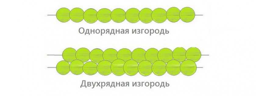 При организации живой изгороди в 2 ряда промежутки между растениями должны быть 0,5–0,7 м, в один ряд — 0,4–0,5 м.