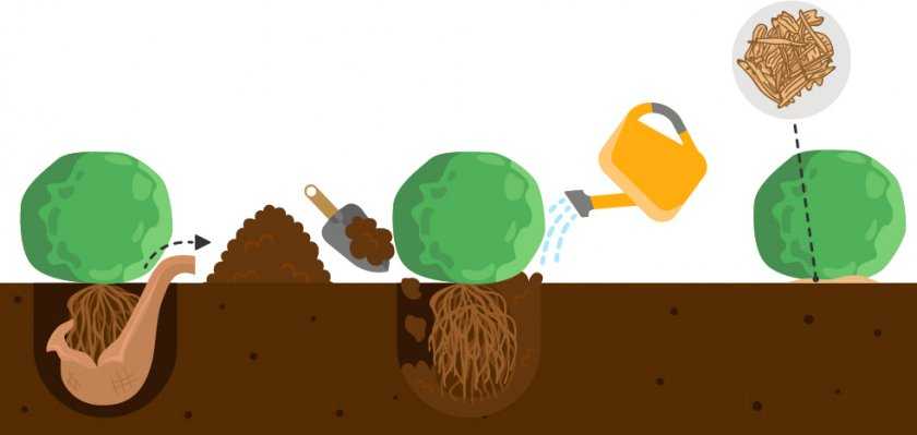 - Хорошо уплотните почву в приствольной зоне, полейте и замульчируйте грунт, чтобы надолго сохранить влагу в земле.