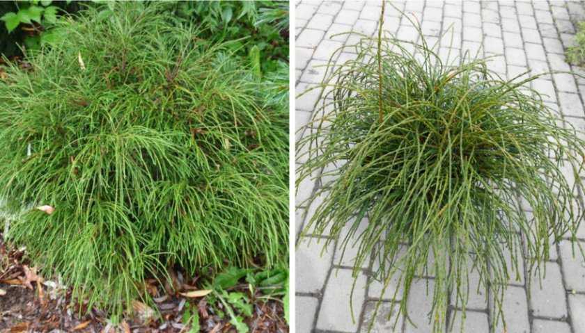 - Филиформис . Дерево невысокое, не вырастает более 150 сантиметров. Растение имеет форму конуса или круга. Отличительной чертой служат свисающие длинные нитевидные побеги. В теплое время года хвоя имеет светло-зеленую окраску. Зимой становится заметен коричневый оттенок на хвое.