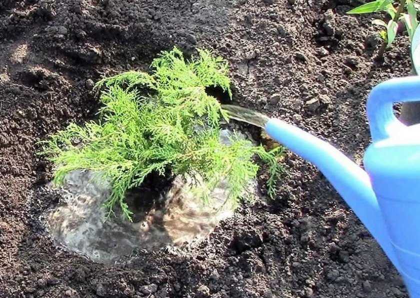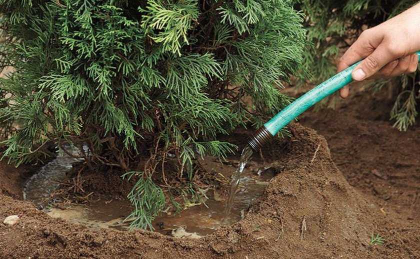 Полив выполняется под корень куста. Желательно проводить увлажнение рано утром или после заката солнца. Также можно сделать дождевание: его проводят исключительно в вечернее время, чтобы солнце не высушивало хвою вместе с водой, что может привести к появлению жёлтых пятен на туе.