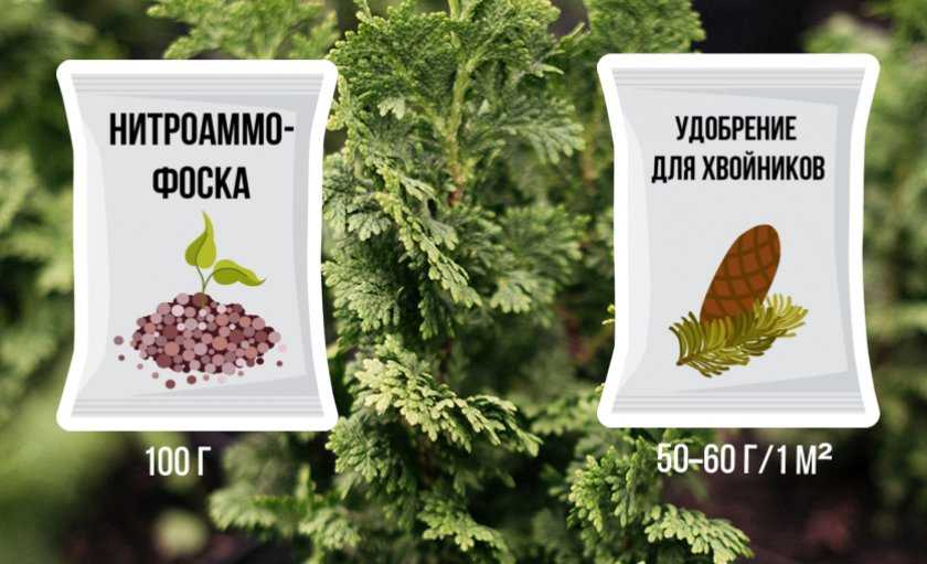 Для підгодівлі недавно висадженими туї використовуйте нізкоконцентрірованной мінеральні добрива для хвойних рослин або органіку, щоб не пошкодити коріння. Через рік, якщо грунт потребує цього, можна вносити підживлення для дорослих туй, наприклад, до 100 г нітроамофоски на 1 кущ або комплексні у кількості 50-60 г на 1 м2. Підгодовують зазвичай навесні.