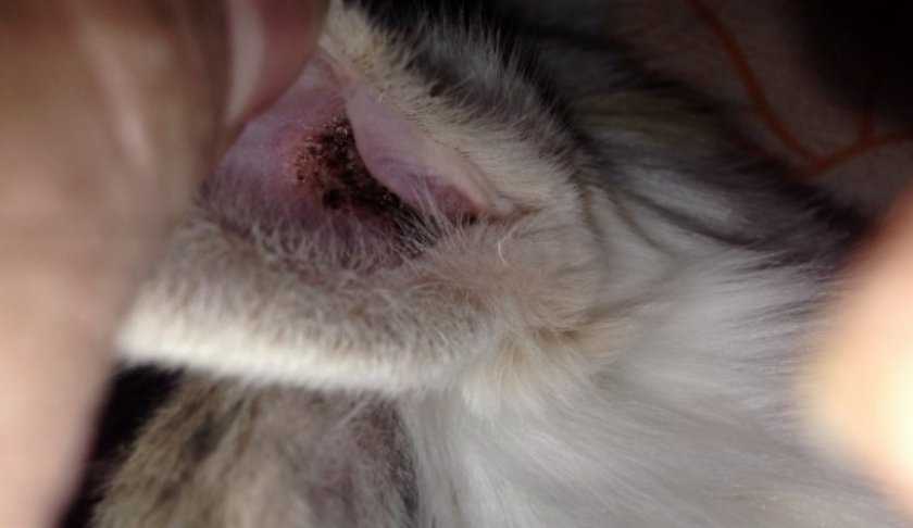 - внутри ушей видны коросты, красные пятна, язвы, бугорки алого или темно-розового цвета;