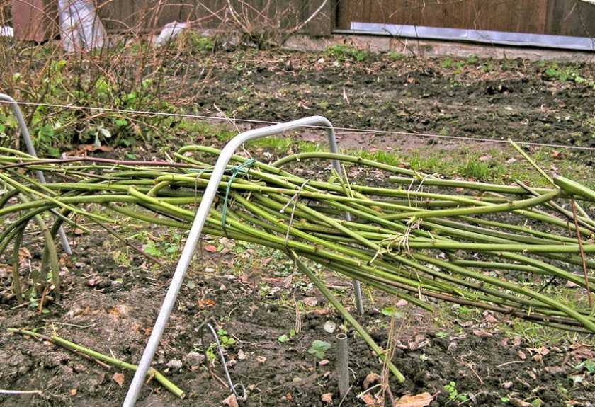 Осенью останется только под корень вырезать средние отплодоносившие стебли, а боковые стебли остается только в том пригнутом состоянии, к которому они за лето привыкли, оставляя из них 8-10 самых крепких. Остальные удалить под корень без пеньков. Оставленные на зимовку стебли укоротить, постараться, как позволяет их гибкость, как можно ниже пришпилить к земле и укрыть безопасным для растений и удобным для вас способом.