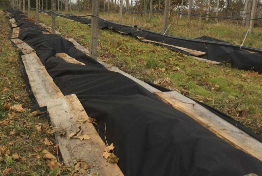 Опытные садоводы также используют различные нетканые средства, в том числе спанбонд, рубероид, агроспан, полиэтиленовую плёнку, лутрасил. Перед тем как воспользоваться укрытием, нужно аккуратно пригнуть стебли к грунту и закрепить, используя крюки или другие подходящие приспособления.