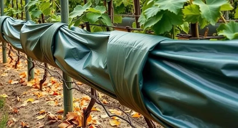 - Укрытие винограда агроволокном: Пошаговая инструкция: 1. Оберните лозу агроволокном в несколько слоев. 2. Закрепите агроволокно прищепками или веревкой. 3. Убедитесь, что лоза полностью закрыта материалом. Преимущества: хорошая воздухопроницаемость, защита от морозов. Недостатки: может быть повреждено грызунами.