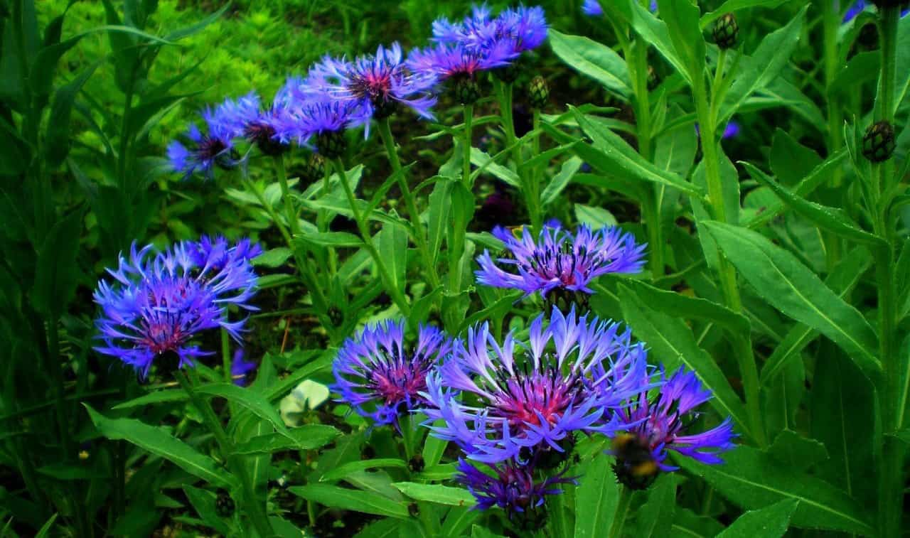- Василек горный. Пожалуй, самый известный из растений-многолетников. Василек горный представляет собой корневищное растение со стеблем 75 см, серо-зелеными листочками, краевыми цветками ярко-синего цвета, а серединными – фиолетового. Диаметр соцветия – до 7 сантиметров. Обязательно посадите на своем участке василек горный, чтобы преобразить территорию и наполнить ее небесными оттенками.