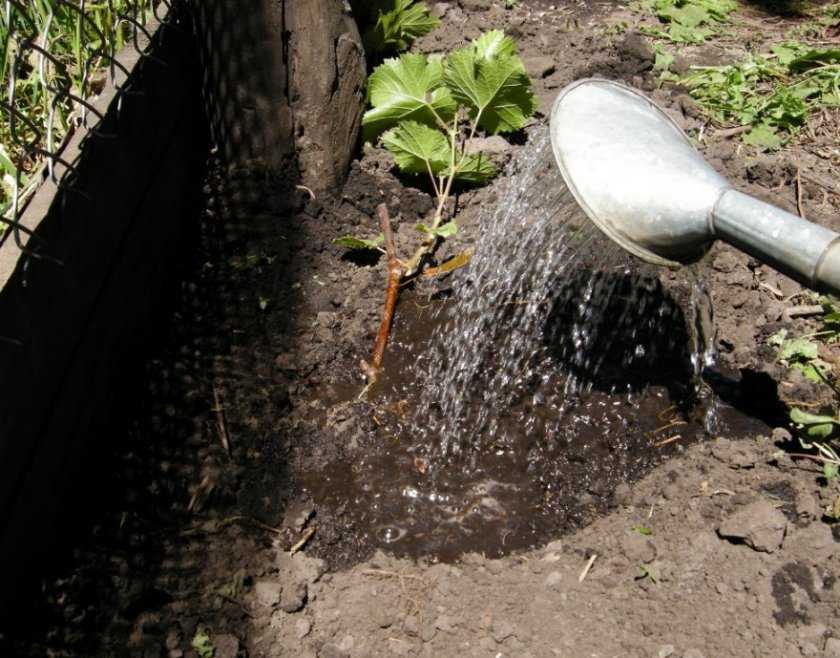 Корни куста перед посадкой окунают в смесь из коровяка и глины в пропорции 2:1. Далее опускают в подготовленные с дренажем лунки и засыпают оставшимся удобренным грунтом. Засыпать нужно до образования горки. В образовавшийся холмик вставить трубку, через которую к корням будет поступать подкормка либо полив. Для того, чтобы почва не пересыхала, можно провести мульчирование (регуляция водных и воздушных режимов почвы вокруг растения при помощи мульчирующих материалов). После посадки следует обильно полить кусты (4-5 ведер на куст).