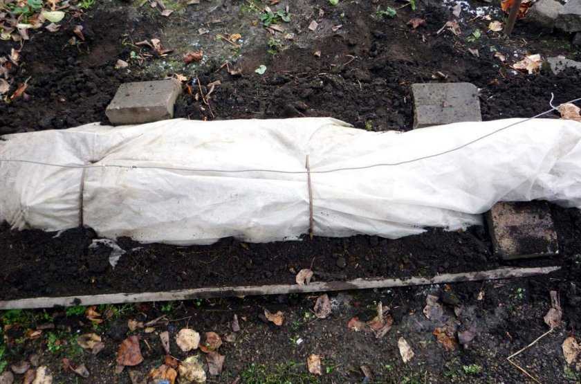 - спорудження над ним каркаса за типом парника з мішковини, сухої трави і соснового лапника (укривний матеріал обов’язково повинен бути сухим);