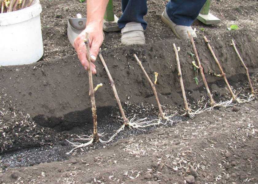 Высаживают черенки примерно через неделю после подготовки почвы, за это время она восстановит свою структуру. Перед высадкой на участках создают небольшие углубления (по размеру корневой системы), в которые и помещают растения. Далее лунки с черенками заполняют грунтом, при этом почву сильно не уплотняют во избежание повреждения корневой системы. Посаженные черенки обильно поливают, после чего им дают время для полноценного укоренения.