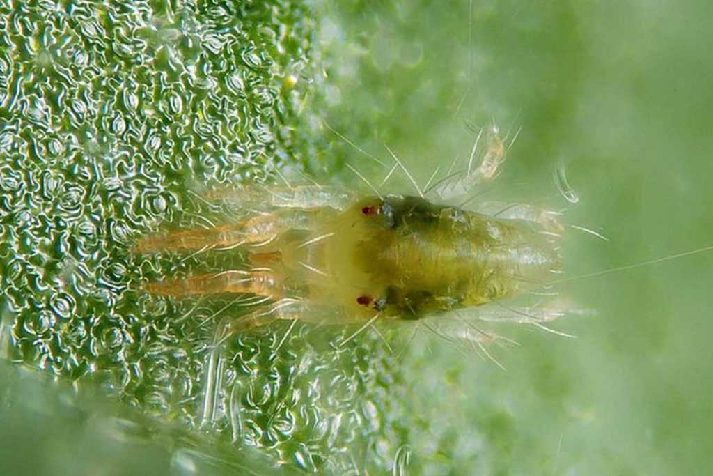 Вредитель питается на листьях. Он прокалывает эпидермис и высасывает содержимое клеток.