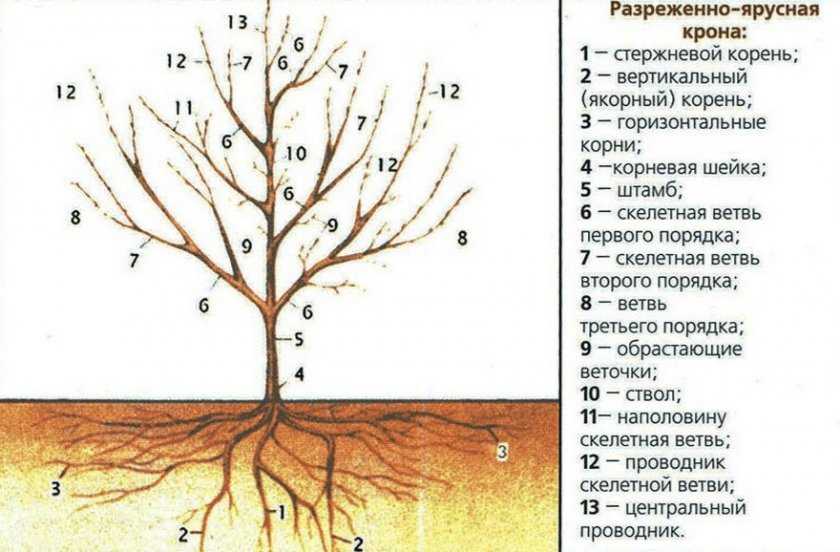 Наиболее приемлемой считается ярусная крона дерева, поэтому по мере роста каждый сезон формируют новые «этажи» из 4–6 ветвей. Расстояние между каждым ярусом выдерживают около 50–60 см. На нижних ветках также формируют ветки второго порядка, располагают их на расстоянии в 50 см между каждой, на остальных ветви второго порядка недопустимы. Для их устранения проводят прореживания, делают их регулярно, весной либо осенью, после опадания листвы.