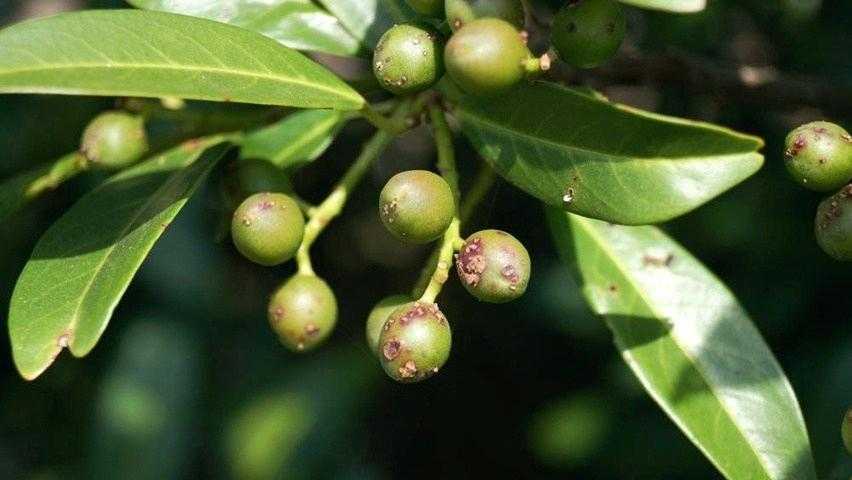 Инфекция вызывает высыхание листвы, которая не опадает, оставаясь на побегах. Распространяется на все части растения. Кора трескается, выделяя камедь, цветы увядают.