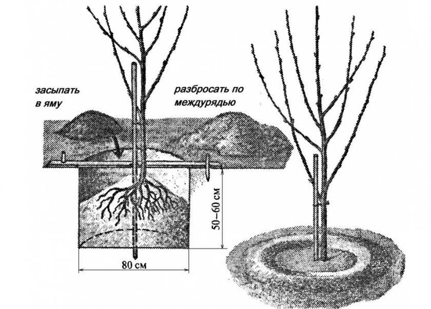 - Выкопайте яму, в которую будете погружать саженец. Ее диаметр должен составлять 80 см, глубина – 50 см. Затем ваши действия должны быть такими: