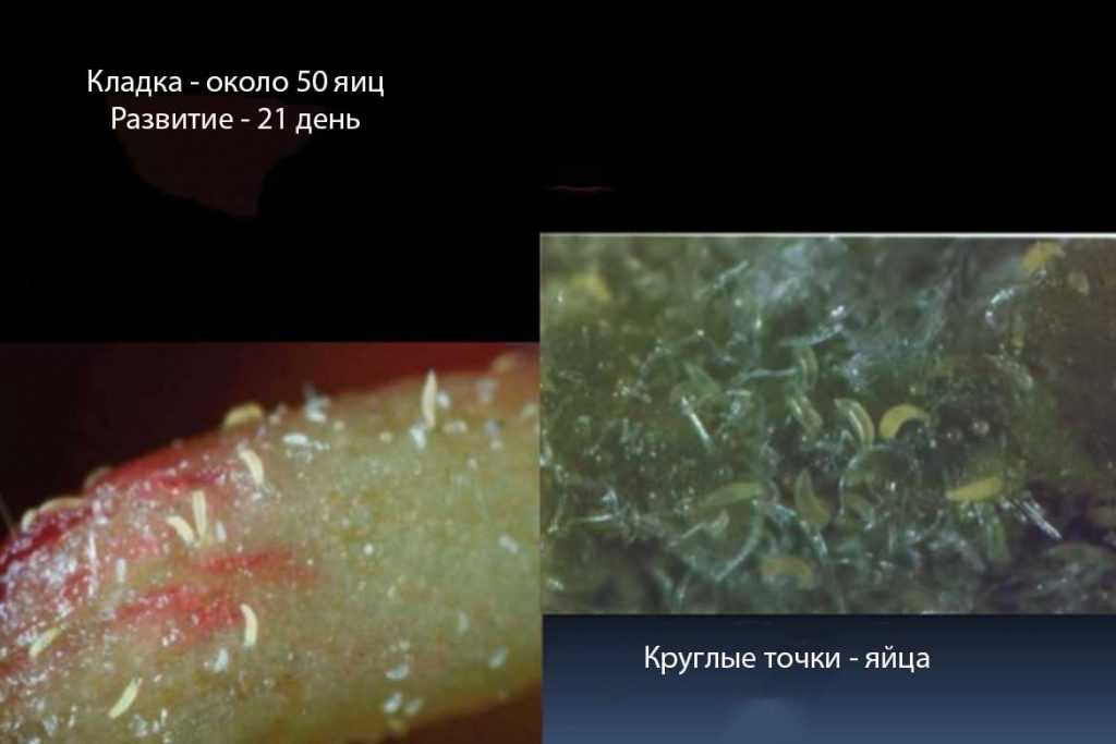 Кладки яиц могут располагаться на листьях, а также в местах их соединения со стеблем.