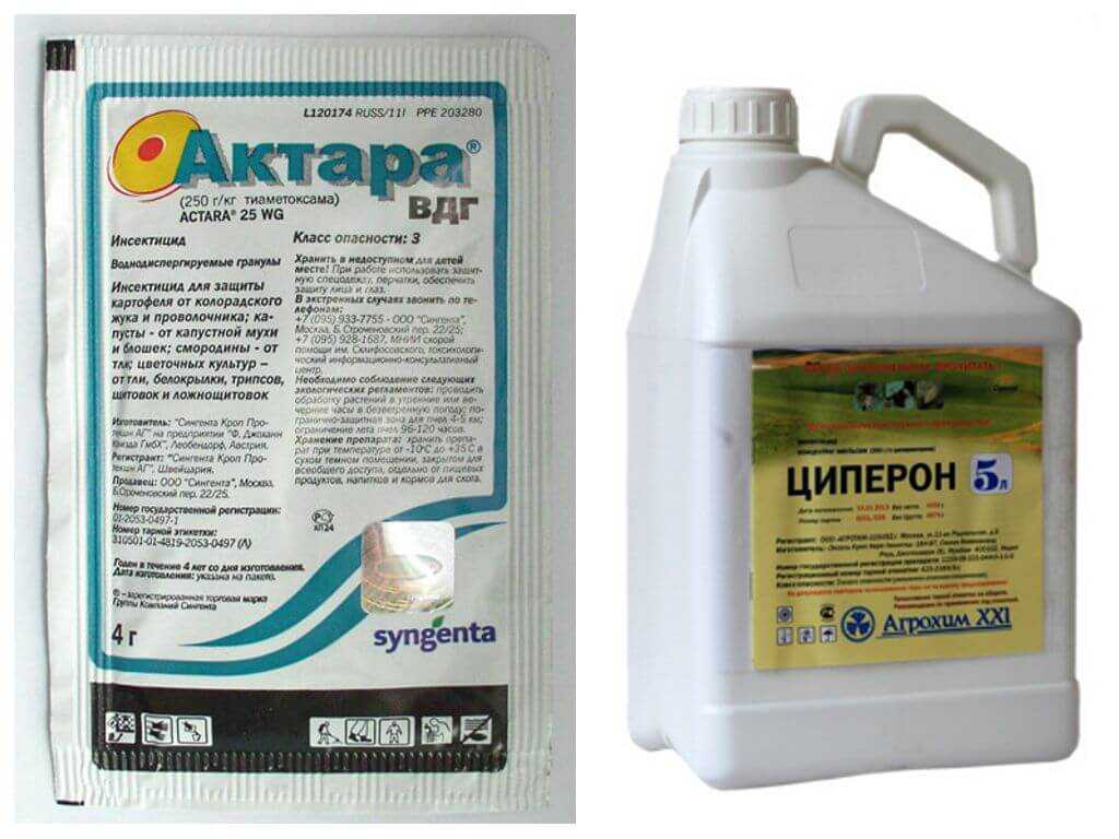 Большим спросом у потребителя пользуется препарат Актара. Его отличительной особенностью является наличие избирательного действия – для вредителей он губителен, а вот полезным насекомым он вреда не причинит. Не менее популярны средства Кунгфу, Регент, Циперон, Фагот, или Вантекс.