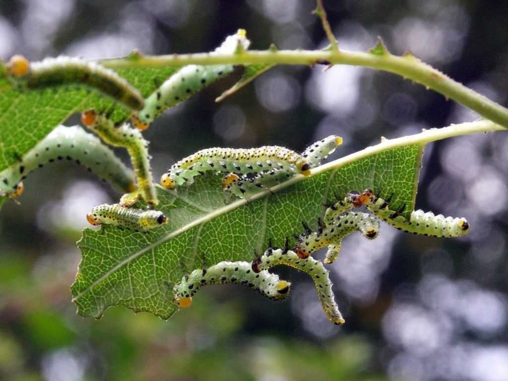 Гусеницы поедают листья почти на всех кустарниках и деревьях сада.