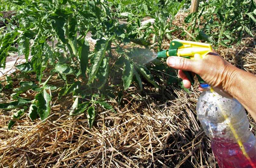 Раствор марганцовки. Обладает широким спектром действий — убивает гусениц совки, удобряет помидорный куст и борется с возникновением бактериальных и вирусных инфекций томатов. Для обработки растений готовят стакан тёмного раствора марганцовки, который потом смешивают с ведром чистой воды. Полученным средством опрыскивают кусты.