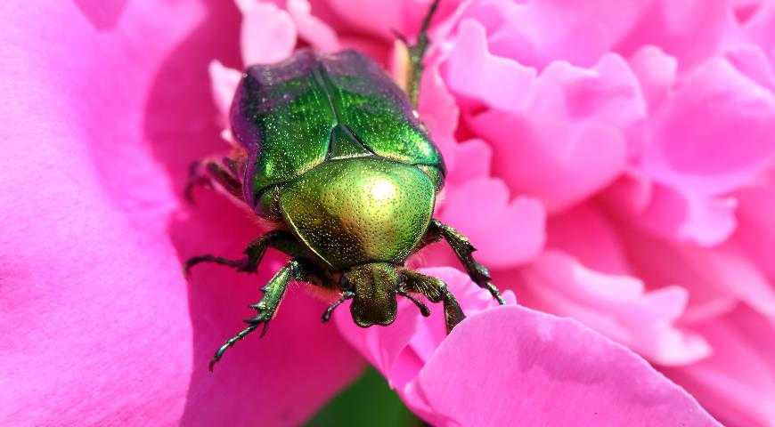 Бронзовка особенно опасна с мая по август: она объедает лепестки, стебли и листья растений. Узнать этого жука легко по золотисто-зеленой спинке, благодаря которой он и получил свое название.