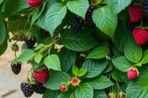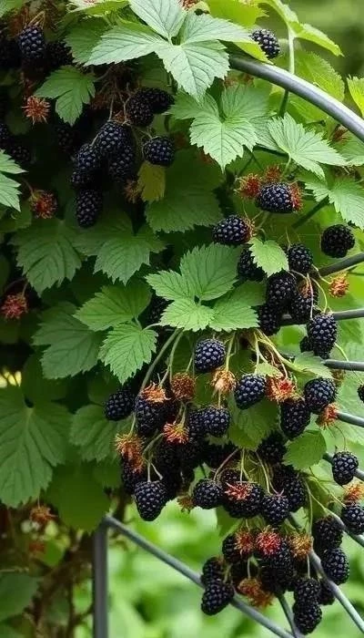 3. Веерная шпалера для ежевики: Идеальна для ремонтантных сортов ежевики. Преимущества: хорошее освещение, вентиляция, удобство сбора ягод. Недостатки: требует прочной конструкции, способной выдерживать вес ягод. Материалы: столбы, проволока, подпорки. Установка: столбы устанавливаются на расстоянии 3-4 метра друг от друга, проволока натягивается веером от каждого столба.