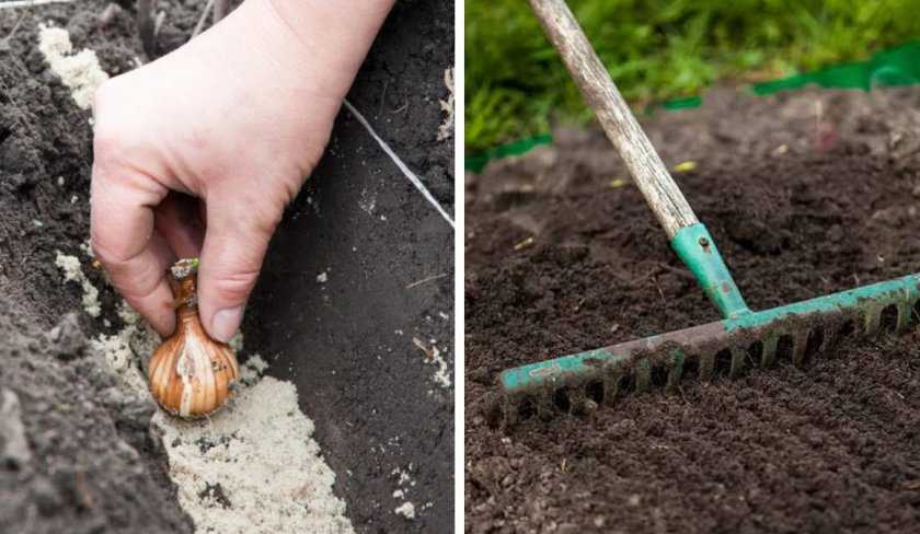 - Поставьте луковицы в лунки (ростками вверх), а затем слегка вдавите в песок и засыпьте плодородным грунтом.