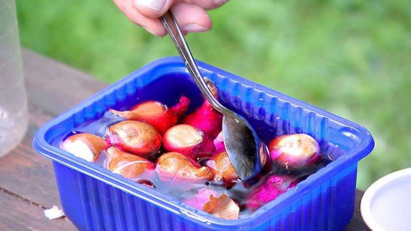 Посадочный материал нуждается в дезинфекции. Для этого его на полчаса замачивают в слабом растворе марганцовки или обрабатывают фунгицидом согласно инструкции. После этого необходимо сразу приступить к высадке. Большие луковицы тюльпанов нужно высаживать на расстоянии не меньше 15 см.