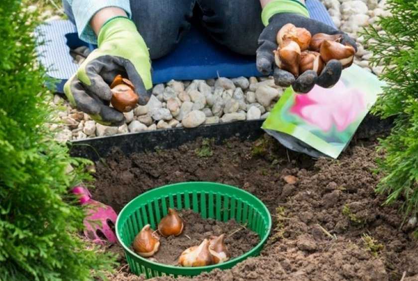 Оптимальный период для высадки тюльпанов — осень. Но можно высаживать и весной, до начала апреля. Если процесс затянуть до июня, то луковицы не успеют вызреть и могут погибнуть. Ранней весной их можно посадить в корзины и держать в погребе. А после отступления весенних заморозков контейнеры можно высадить в цветник.