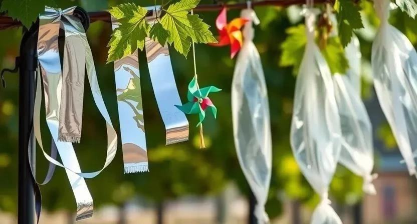 - Мишура и фольга: Мишуру и фольгу можно развешивать на лозе, между рядами винограда или на близлежащих деревьях. Они создают блики, которые отпугивают птиц. Эффективность этого метода зависит от интенсивности солнечного света и силы ветра. Я заметил, что в пасмурную погоду мишура работает хуже.