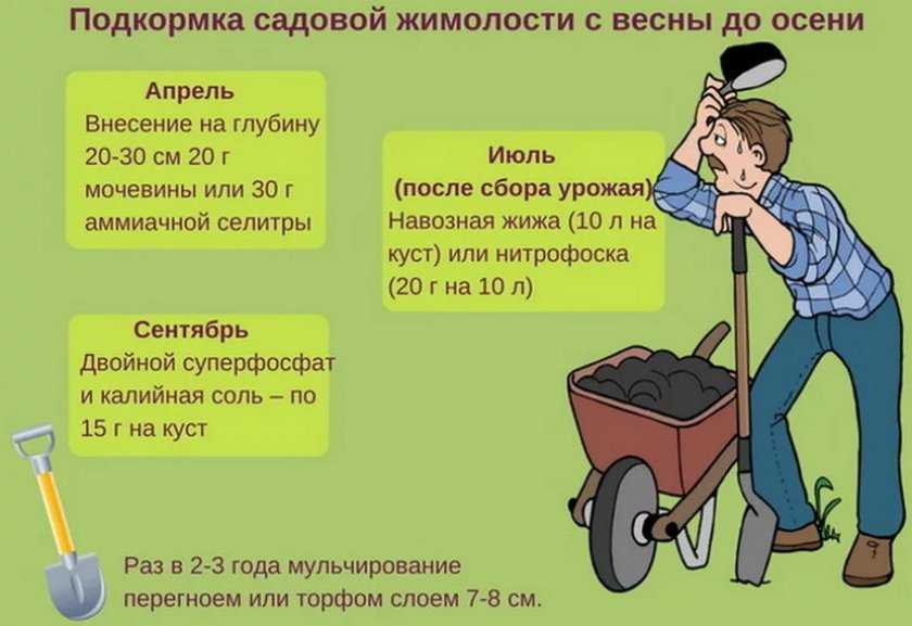 Удобряйте жимолость дважды в год Весна. Первый раз вносите удобрение в апреле, после прогревания почвы. Используйте или комплексный состав, подходящий для рассматриваемого растения, или древесную золу. Золу лучше всего настоять в воде (литровая банка на ведро теплой воды) в течение 2-3 дней. Лето. Втора подкормка производится в конце июня — начале июля. Используется тот же состав, что и весной. Позже подкармливать куст не нужно, так как он очень рано засыпает