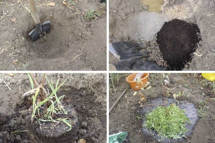 Лунку для молодого растения готовят заранее, засыпав в нее ведро компоста, горсть золы и внеся пару ложек полного минерального удобрения. Субстрат тщательно перемешивают и оставляют на 2–3 дня оседать.
