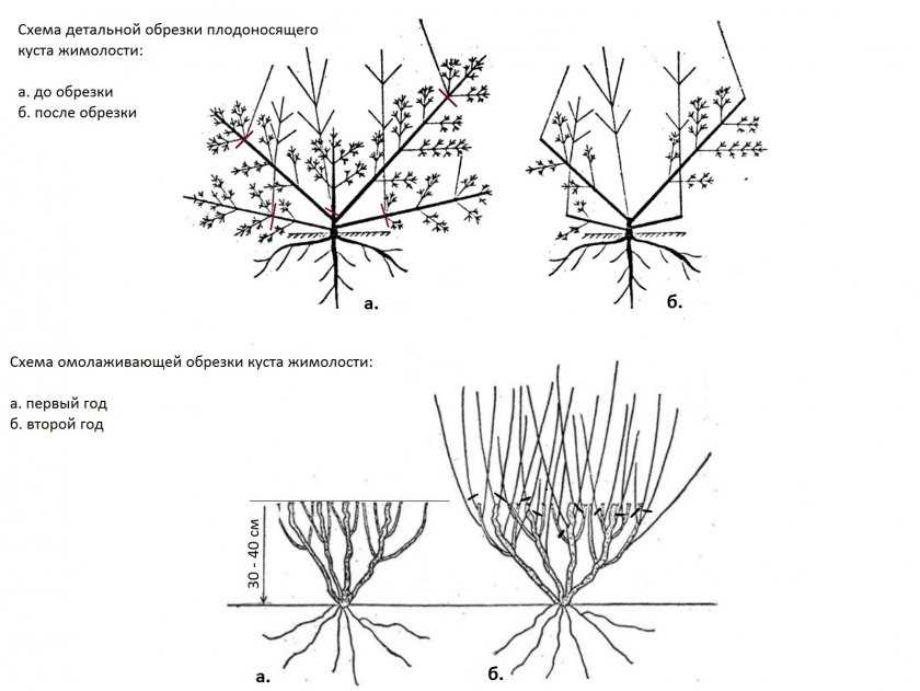 Простота формирования не отменяет ежегодную санитарную обрезку и прореживание. Каждую весну выстригайте все сучки, растущие внутрь кроны и вниз к земле. Если ветки скрещиваются, мешают друг другу, затеняют, вырежьте самую корявую, портящую вид куста. Удалять её нужно частями, то есть разрезав на куски. Если вы будете вытягивать из куста кривые ветки целиком, то повредите остальные. Во время обрезки старайтесь придать кусту красивый вид, то есть оставляйте побеги равноудалённые друг от друга, направленные в разные стороны и вверх. Вырезайте растущие низко вдоль земли. Такие ветки хороши для размножения горизонтальными отводками, но ягод на них обычно не бывает.