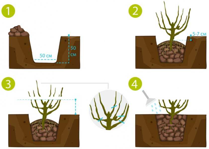 Если в качестве посадочного материала используют молодое растение, необходимо подготовить ямку размером 50×50×50 см. На дно засыпают дренаж слоем 5–7 см, который покрывают почвой, смешанной с песком и торфом, в соотношении, указанном ранее. Заглубляют саженец до уровня корневой шейки.