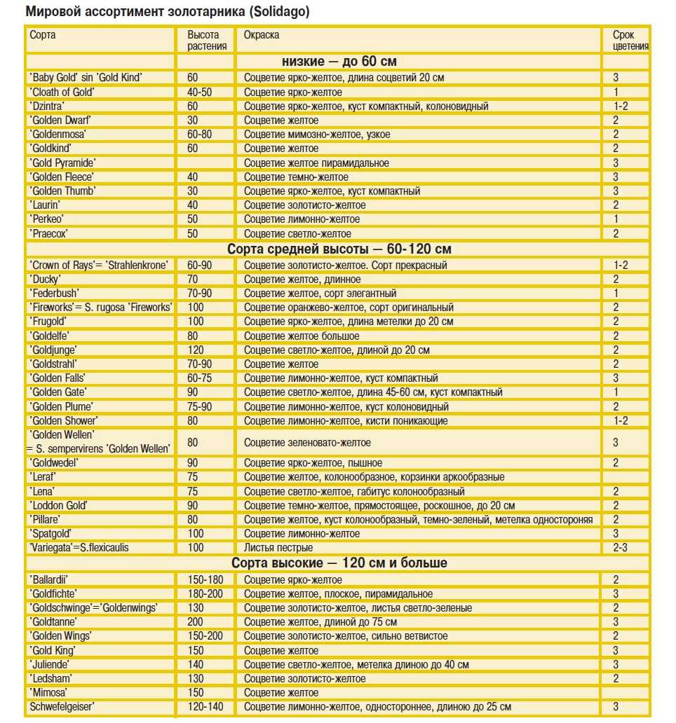 Также можно выделить условные группы сортов золотарника по высоте: